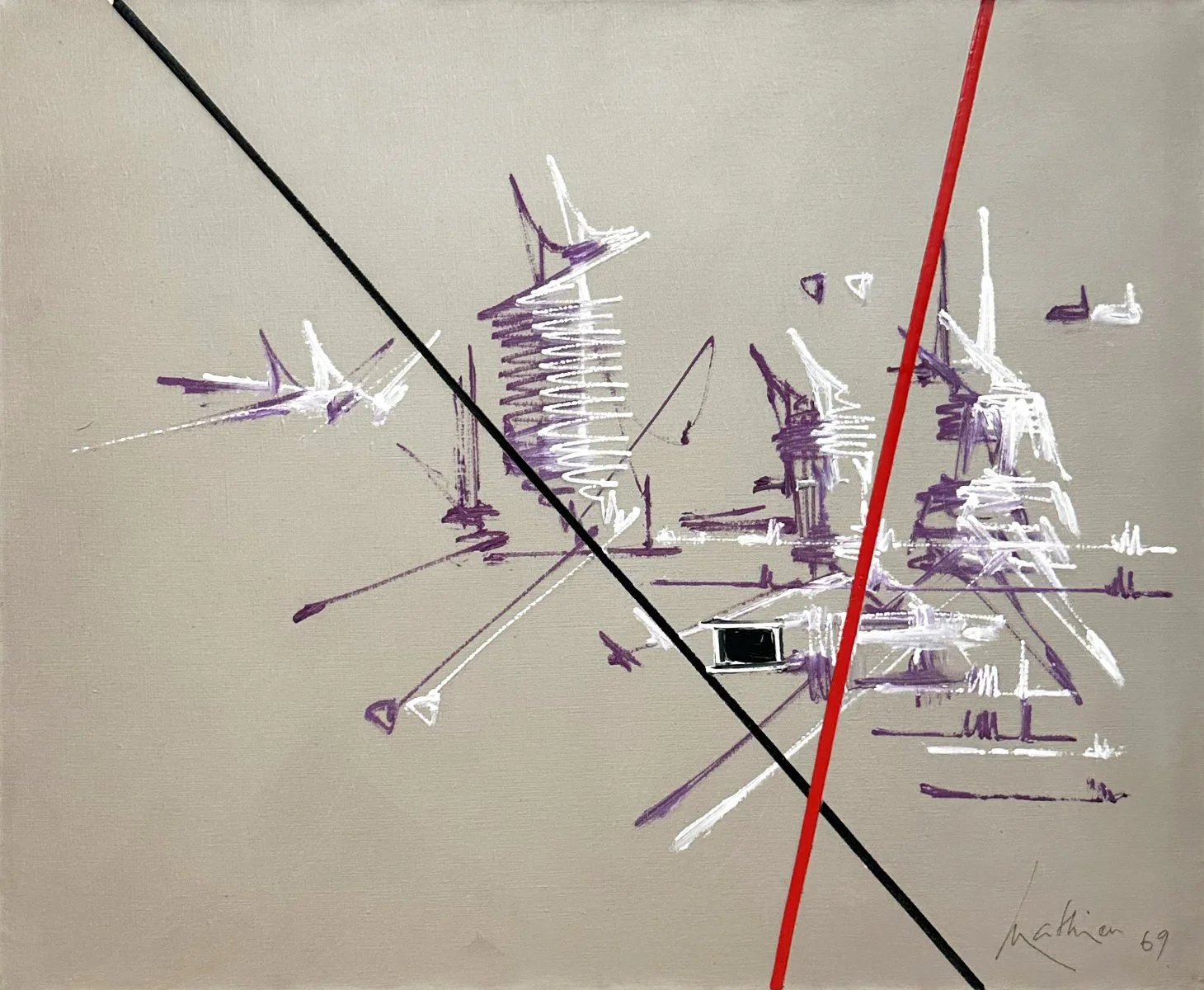 Georges Mathieu, après des études en Lettres, Droit et Philosophie, se lance dans la peinture en 1942. Dès 1947, il rejette l’abstraction géométrique et devient le pionnier de l’Abstraction Lyrique, un mouvement qu’il défend avec force. Ses premières œuvres tachistes apparaissent en 1950, marquant une étape importante dans son parcours. Son travail l’amène à exposer dans des musées du monde entier, dont ceux de Cologne, Bâle et Genève.