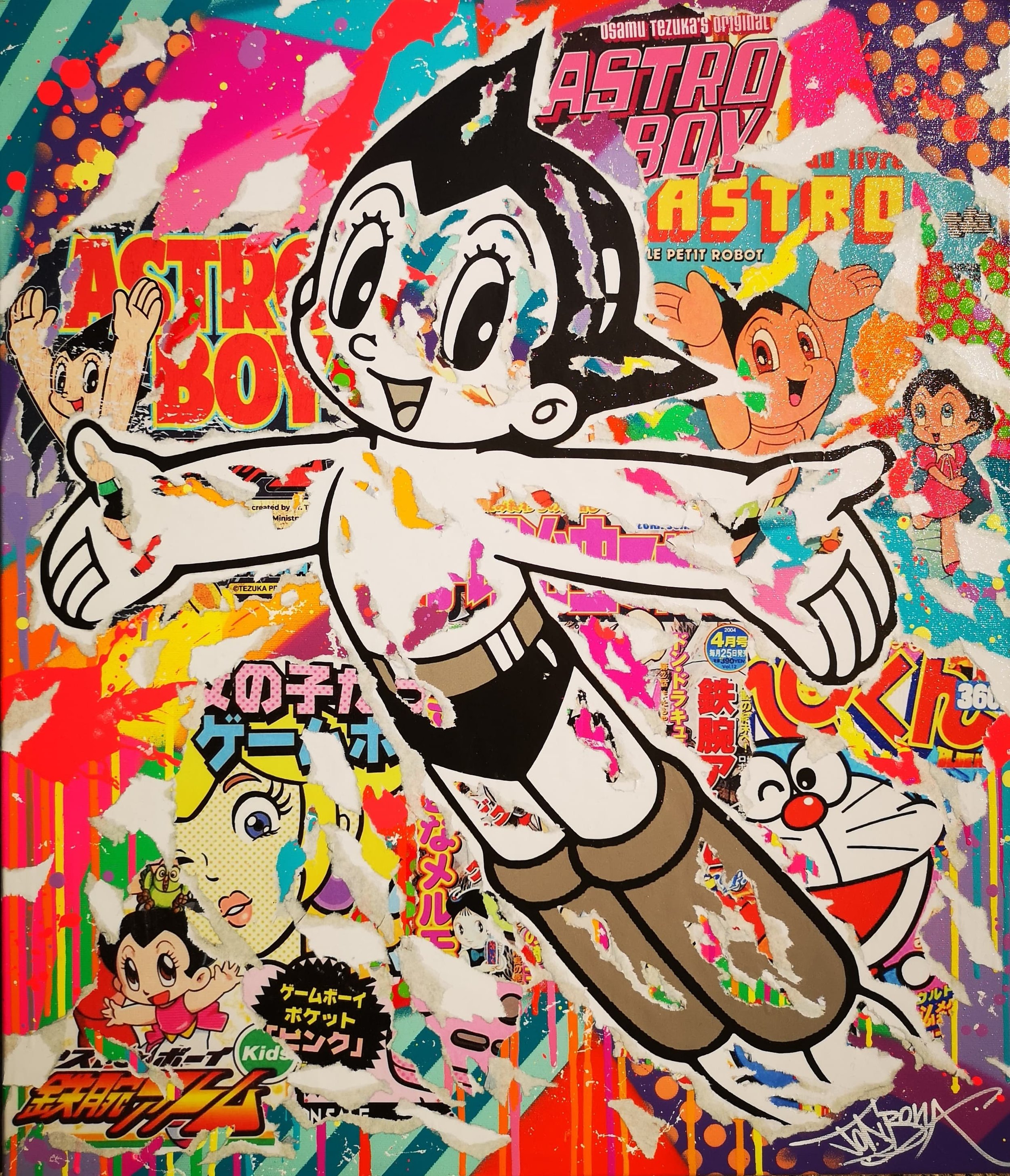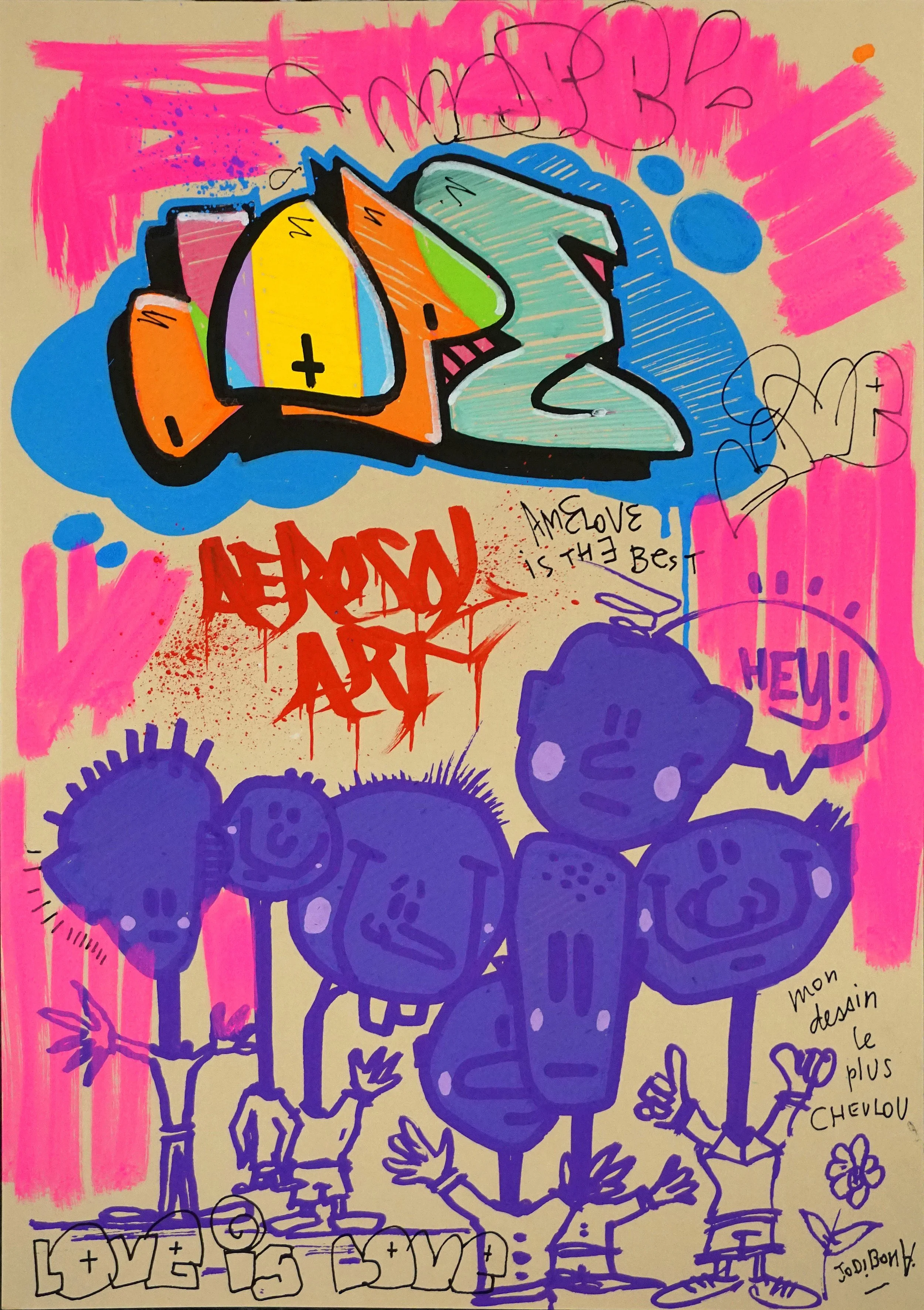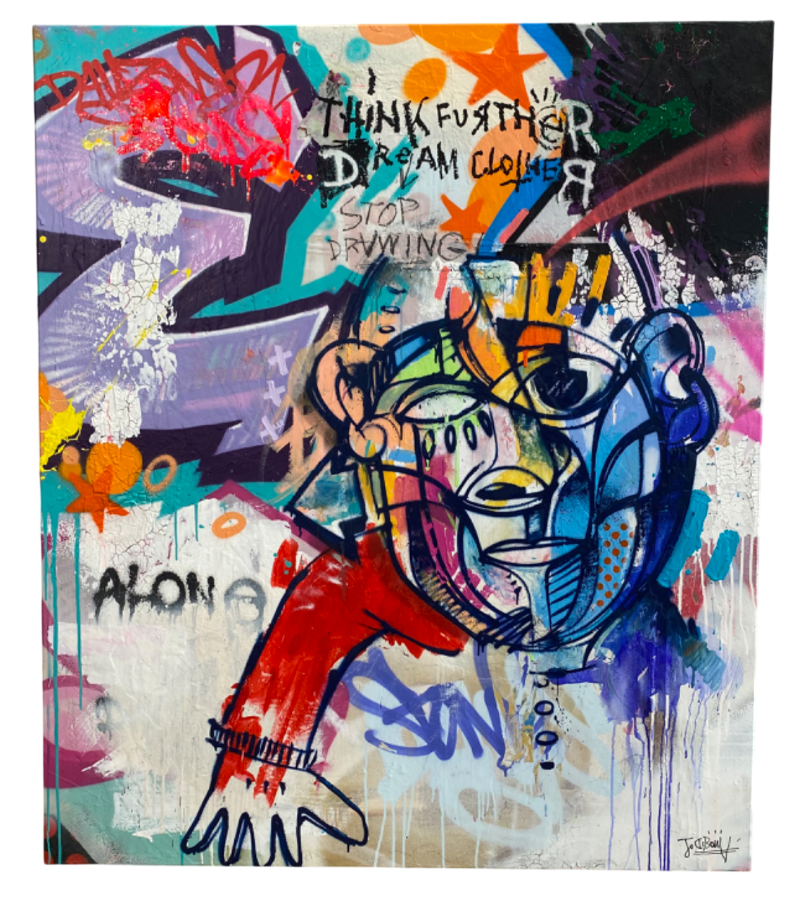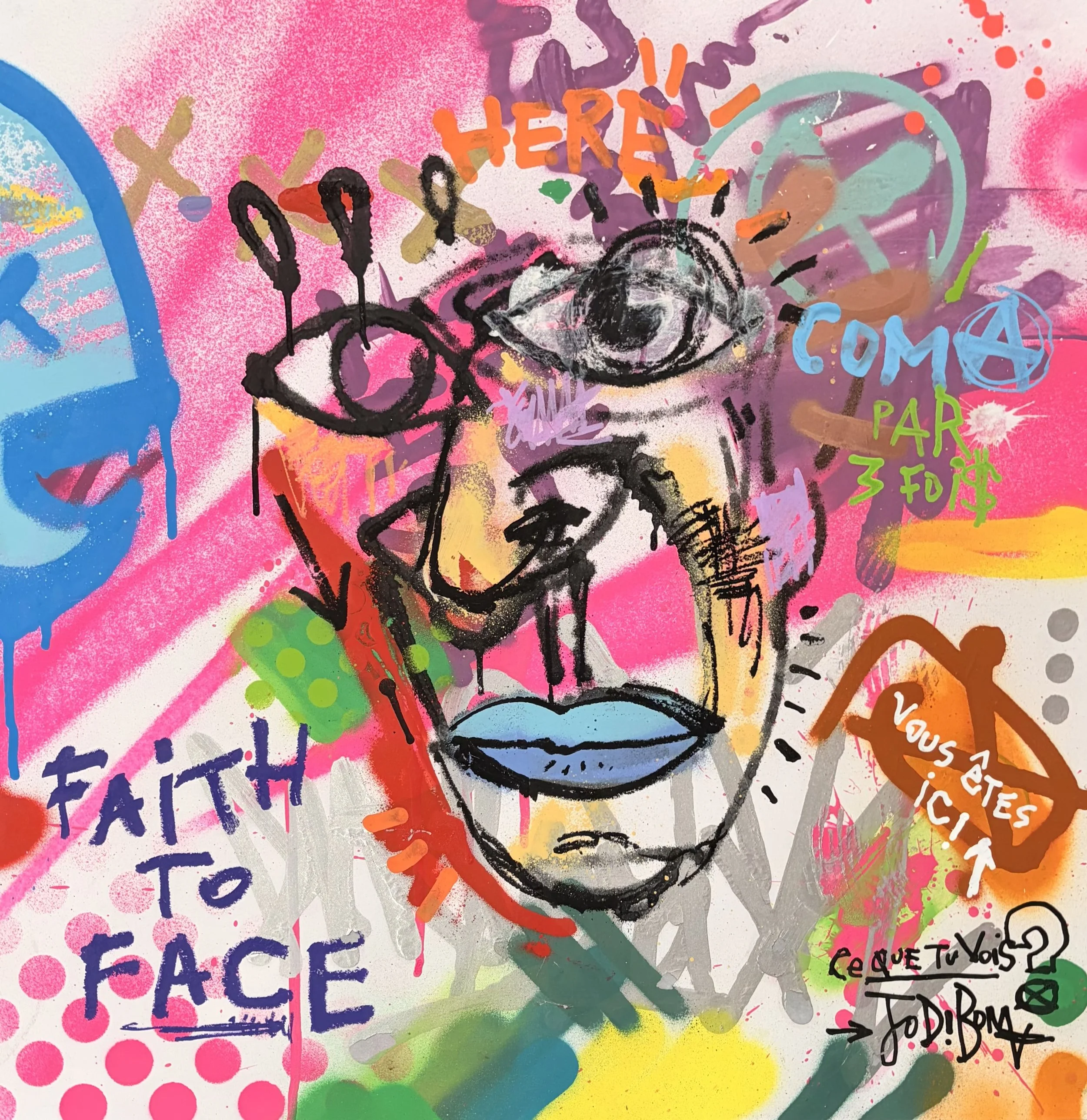 Figure emblématique de la scène Street Art parisienne, Jo Di Bona doit son succès fulgurant à sa technique unique qu’il a lui-même inventée : le Pop Graffiti, où il associe collages, diverses influences du graffiti et la culture pop dont il s’est profondément imprégné. Fauviste des temps modernes, Jo mélange couleurs et mouvements pour créer des visages empreints de poésie, d’émotions et de joie de vivre. Dans ses oeuvres, Jo rend hommage avec la même tendresse aux icônes et grands personnages de l’histoire qu’aux inconnus de passage, nourri par le regard généreux qu’il porte sur l’humain car “le plus important à ses yeux, c’est le partage”.