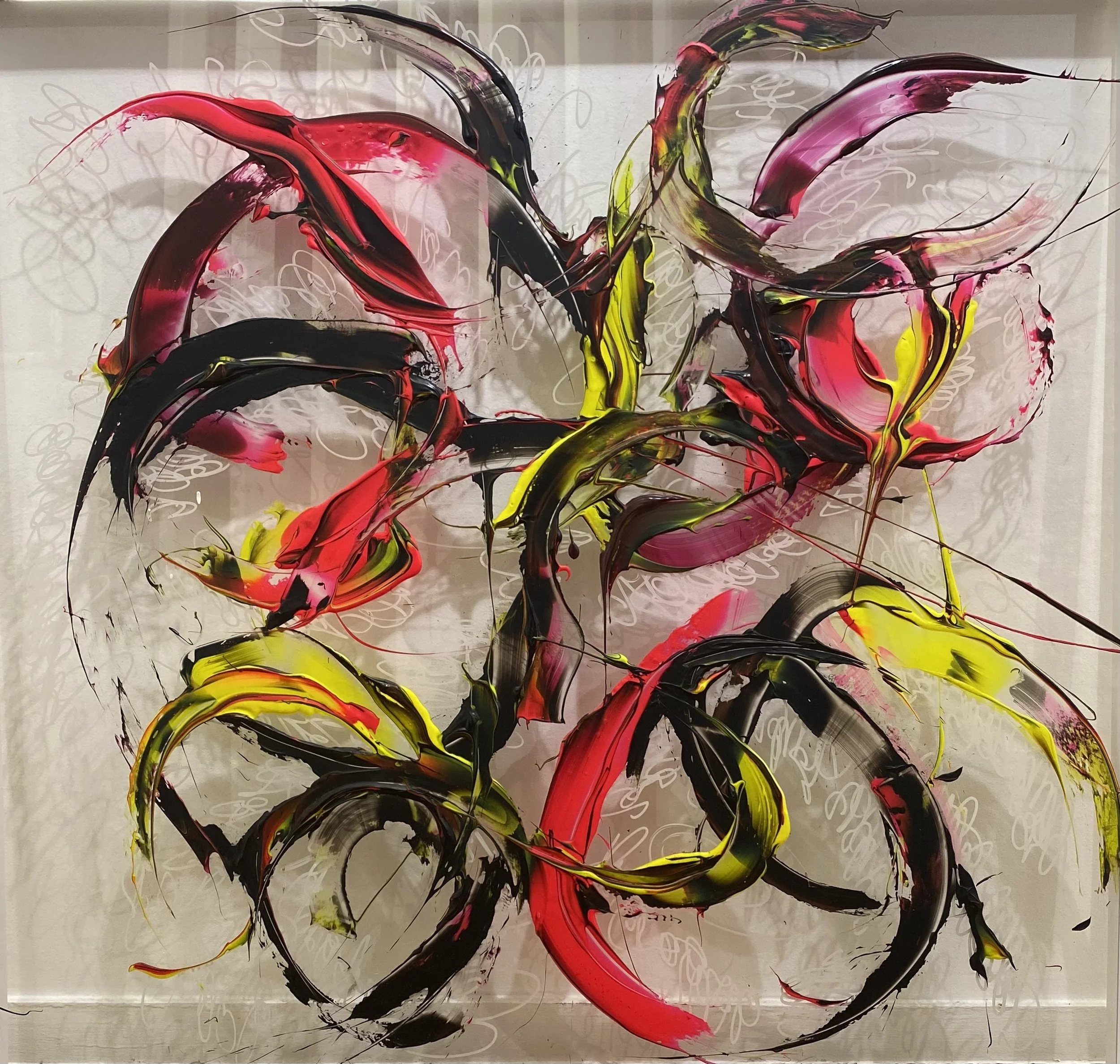 Sophie Chir puise son inspiration dans l’univers des mangas, le street art et son expérience à la Maison Lemarié, célèbre pour le Camélia de Chanel. Elle crée des toiles abstraites et florales qui rappellent la calligraphie.